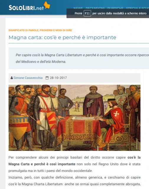 Abusando di questo spazio, e della pazienza dei due amici che mi seguono, segnalo questo link: https://www.sololibri.net/Magna-carta-cos-e-perche-importante.html