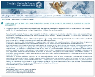 Avvocatura, specializzazioni: il CNF ha approvato in via definitiva regolamento sulle associazioni forensi specialistiche 11/04/2013 - Istituito l’elenco delle Associazioni forensi specialistiche maggiormente rappresentative che parteciperanno con i Consigli dell’Ordine all’organizzazione dei corsi per l’acquisizione del titolo di avvocato specialista Roma. Il Consiglio Nazionale Forense ha approvato oggi in via definitiva il regolamento che istituisce e disciplina l’elenco delle associazioni forensi specialistiche maggiormente rappresentative, in attuazione dell’articolo 35 comma 1 lettera s) della legge n. 247/2013 (Nuovo ordinamento della professione di avvocato). Le associazioni specialistiche inserite nell’elenco parteciperanno con i Consigli dell’Ordine all’organizzazione di corsi per l’acquisizione del titolo di avvocato specialista, che rappresenta uno dei punti qualificanti della riforma forense. Spetta invece al ministero della giustizia adottare il regolamento per la definizione delle modalità per ottenere il titolo di specialista. Il regolamento stabilisce che l’elenco delle associazioni maggiormente rappresentative sia pubblicato sul sito del CNF e sia costantemente aggiornato. Esso fissa i requisiti di iscrizione nell’elenco, tra i quali figurano un numero di iscritti significativo su base nazionale tenuto conto del settore di interesse, la previsione espressa tra gli scopi statutari della promozione del profilo professionale specialistico e la formazione e l’aggiornamento, una sede nazionale e un organismo di coordinamento delle attività svolte sul territorio nazionale. Tra i requisiti sono annoverati anche quello di assicurare una offerta formativa nelle materia di competenza attraverso strutture organizzative e tecnico-scientifiche adeguate e di dimostrare di aver organizzato, almeno nell’anno precedente alla richiesta di iscrizione, una significativa attività formativa nel settore di interesse. Le Associazioni non dovranno avere scopo di lucro, l’attività formativa dovrà essere gratuita salva la possibilità di richiedere ai partecipanti il rimborso delle spese sostenute.