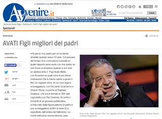 "Questi ragazzi che spesso hanno patito per l’assenza di una figura paterna, ostaggio di madri iperprotettive, diventano ombrosi e aggressivi. "Io lo so perché ho tanti giovani assistenti sul set, che mi raccontano le loro vite. "Però io ho un’esperienza magnifica in generale con le persone disturbate, come ho dimostrato in tante pellicole: sono le persone più fantasiose, che escono dall’omologazione, sono imprevedibili e ti fanno fare cose magnifiche. Con loro ti arricchisci" Grazie ad Avvenire e a Pupi Avati, Intervista completa al link indicato. 17.09.2014 Spataro Avvenire.it Link: http://www.avvenire.it/Spettacoli/Pagine/AVATI%20.